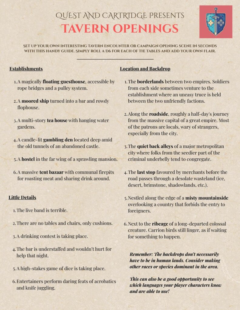 Well, we certainly did. Apart from having recently shared some thoughts about what we love about D&D taverns, we also decided to put together a handy 2-page PDF that can help you make your taverns more interesting and impactful!